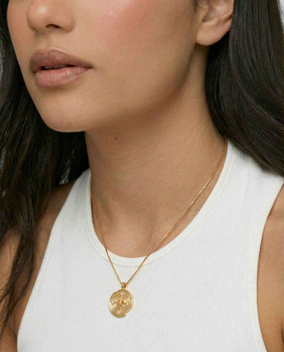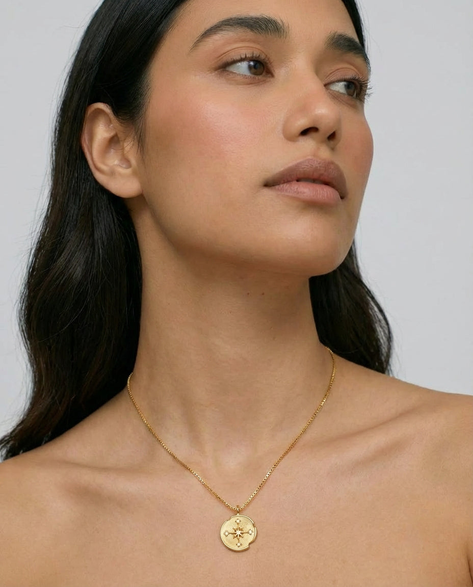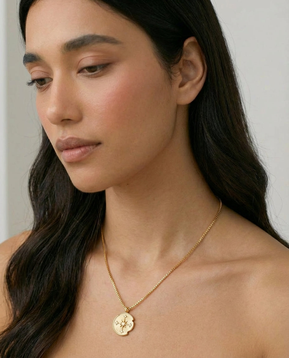 Compass Necklace is inspired by the quiet guidance of the stars. A delicate round pendant rests at the centre of a fine chain, engraved with a radiant star motif that catches the light with subtle brilliance. Elegant and symbolic, the piece evokes a sense of direction, wonder, and timeless celestial beauty.