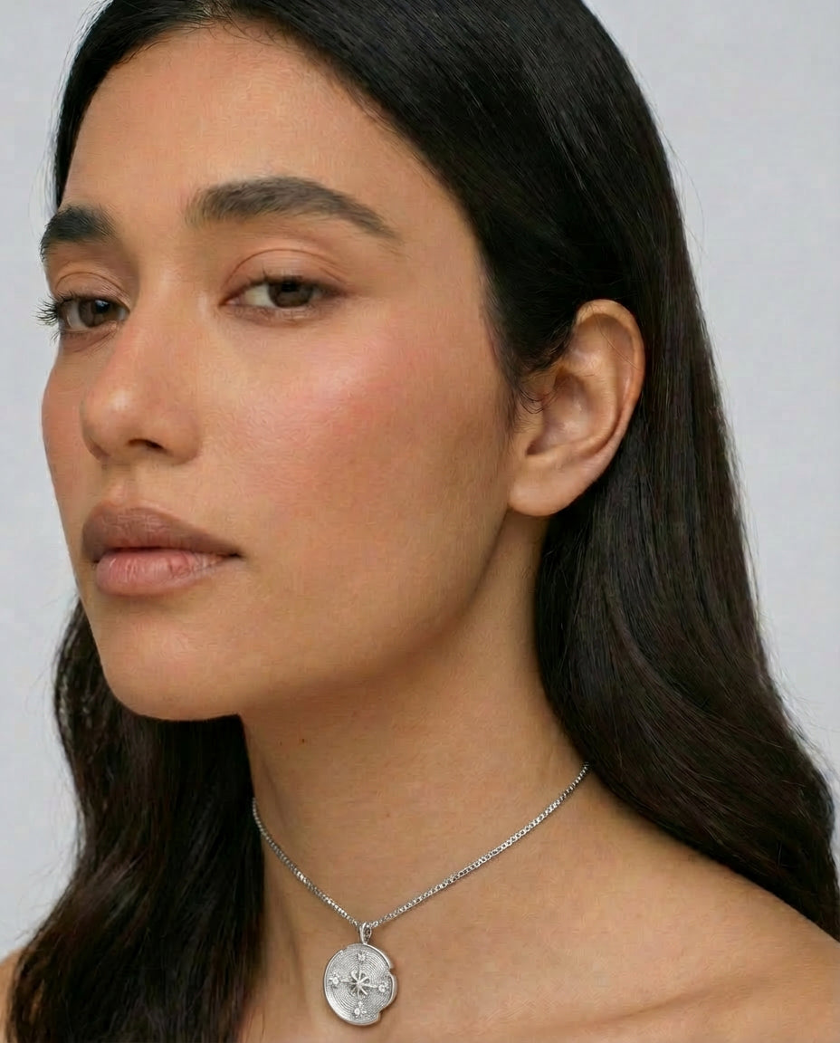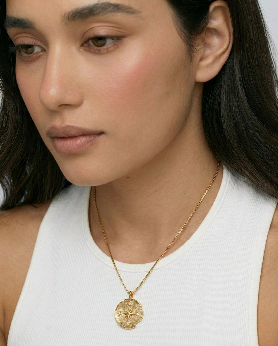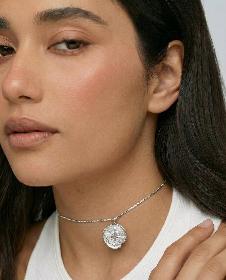 Compass Necklace is inspired by the quiet guidance of the stars. A delicate round pendant rests at the centre of a fine chain, engraved with a radiant star motif that catches the light with subtle brilliance. Elegant and symbolic, the piece evokes a sense of direction, wonder, and timeless celestial beauty.