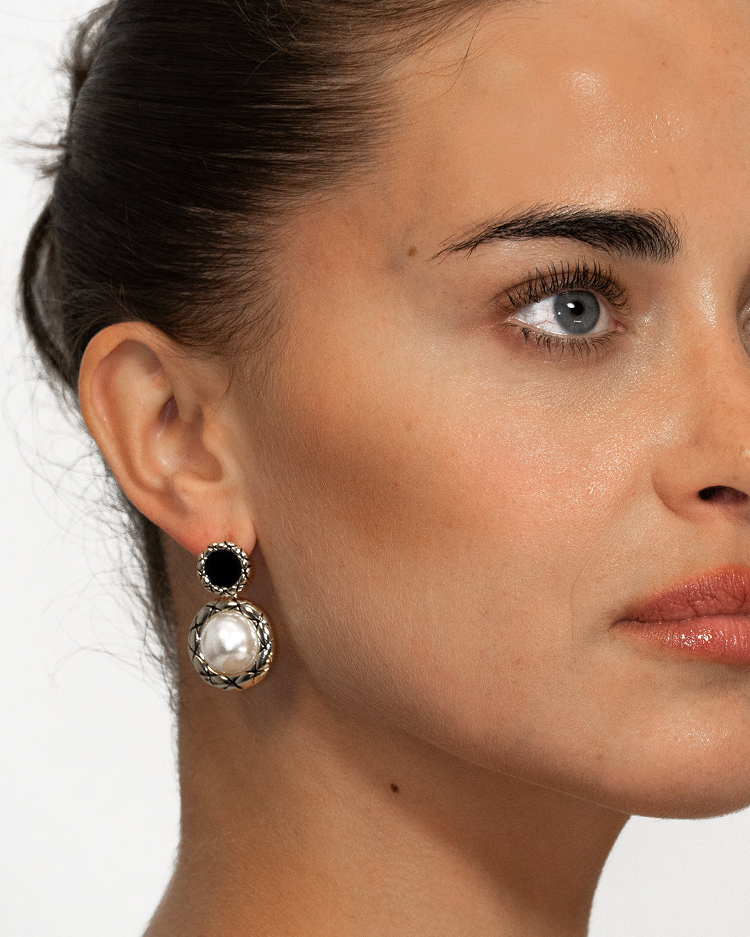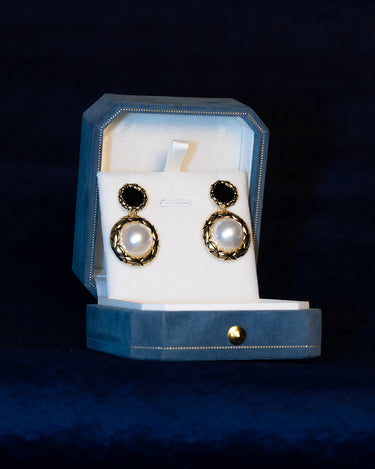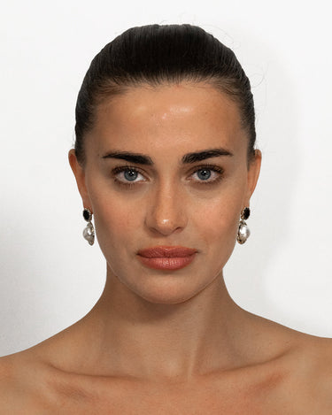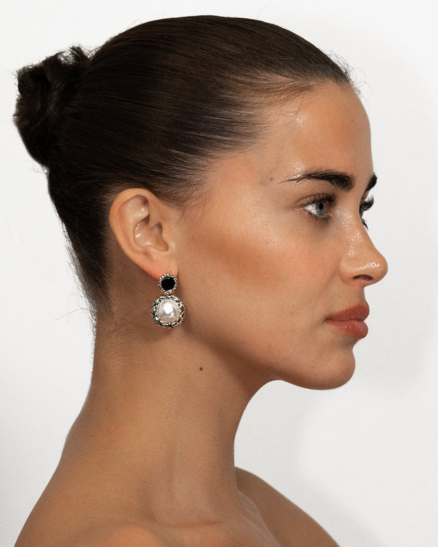 Midnight Fallen is a pair of earrings inspired by haute monochrome. Black, white, and gold intersect in clean, minimal lines, finished with a softly dangling pearl for a modernist statement.